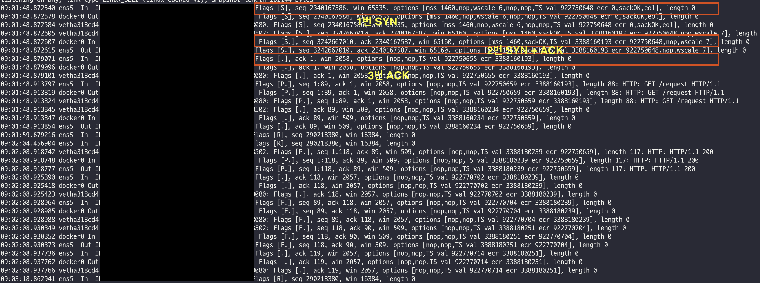 패킷 전송 과정 1번 2번 3번 과정을 통해 3handshake 과정이 일어난걸 확인할 수 있습니다.