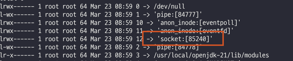 FD 정보 (Socket FD 1개) max-connection 을 1으로 설정하고 3개의 요청을 하게되면 아래와 같이 fd가 1개만 생성됩니다.