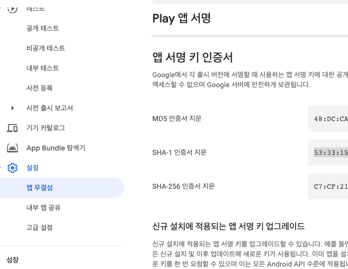 앱 서명 해시키 등록하고자 하는 앱에 들어간뒤 -> 설정 -> 앱 무결성 메뉴에 들어가면 SHA-1 인증서 지문이 있다.